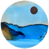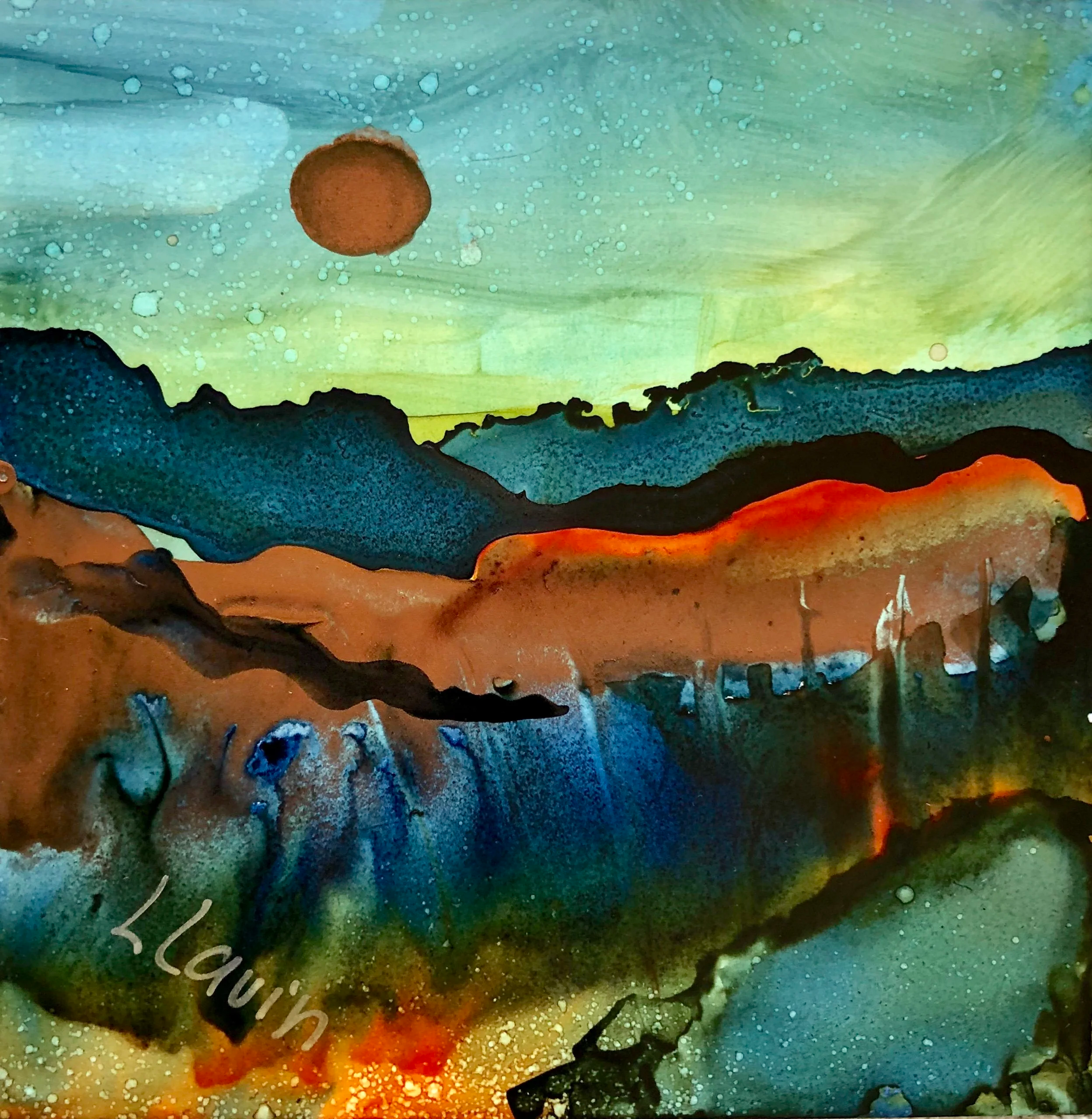 My practice centers on a co-creative process of discovery. Done without brushes, ink is dropped on impervious surfaces (yupo paper or ceramic tile), then slowly moved by tilting, scraping and blending the ink with the kinds of tools mentioned above. As the inks flow and bloom a myriad of colors and shades emerge. The process of coaxing the ink through timing and choice of tools allows the painting to emerge. Alcohol inks are blends of basic colors. As such when applied and allowed to mingle an array of “found colors” materializes. For example the painting Yellow Bloom is composed of only yellow and black ink but subtle greens, orange and peach emerged through my process. My paintings typically use 2 or 3 colors of ink with all other colors resulting from the interaction of the inks. Blended colors often create neutrals that occur more naturally in the “real world” thus lending unity to the paintings. See Full Moon. Mixing inks with a coffee stirrer results in a graded blend of color whereas application of a contrasting ink that then meets a dryer area results in the emergence of lines. A ridge becomes a horizon ready for more ink to define details and features. Reflection Lake is an example of this process. Additional alcohol or more ink revives the liquidity allowing me to further refine the design, add texture, and create embellishments.